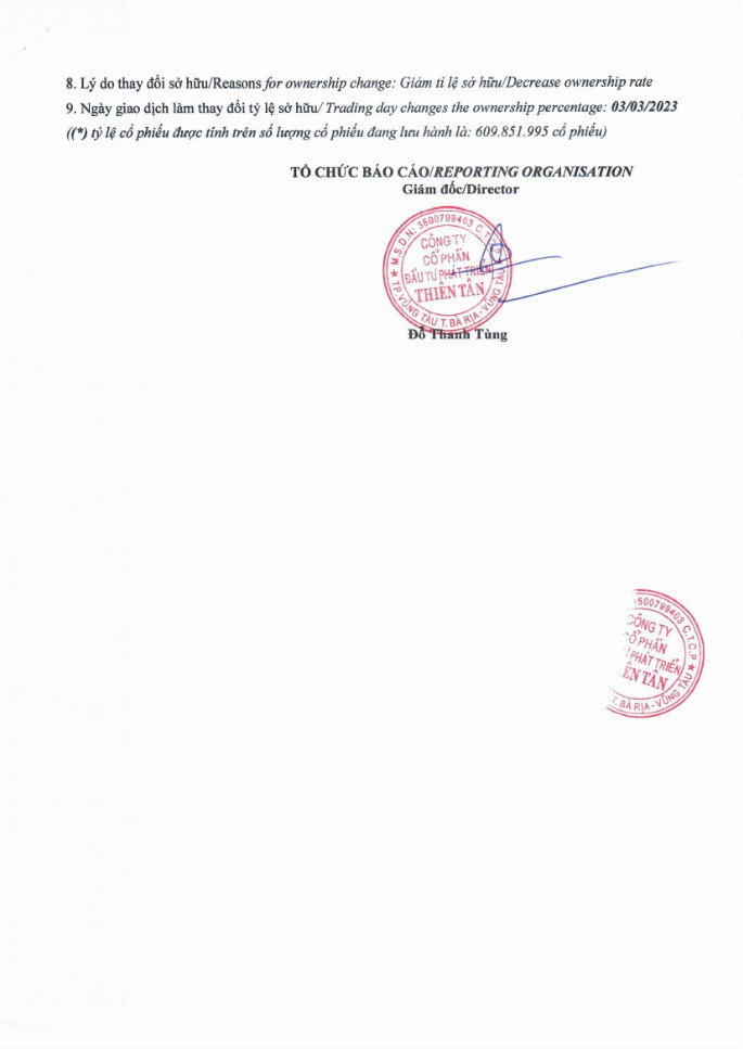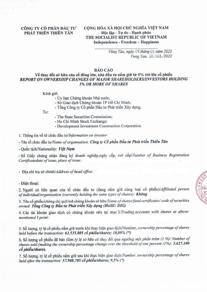 Theo đó, với lý do giảm tỷ lệ sở hữu, Thiên Tân đã tiến hành bán ra 3,63 triệu cổ phiếu DIG, hạ sở hữu tại DIC Corp xuống còn 57,91 triệu cổ phần, tương đương 9,5% vốn điều lệ công ty.