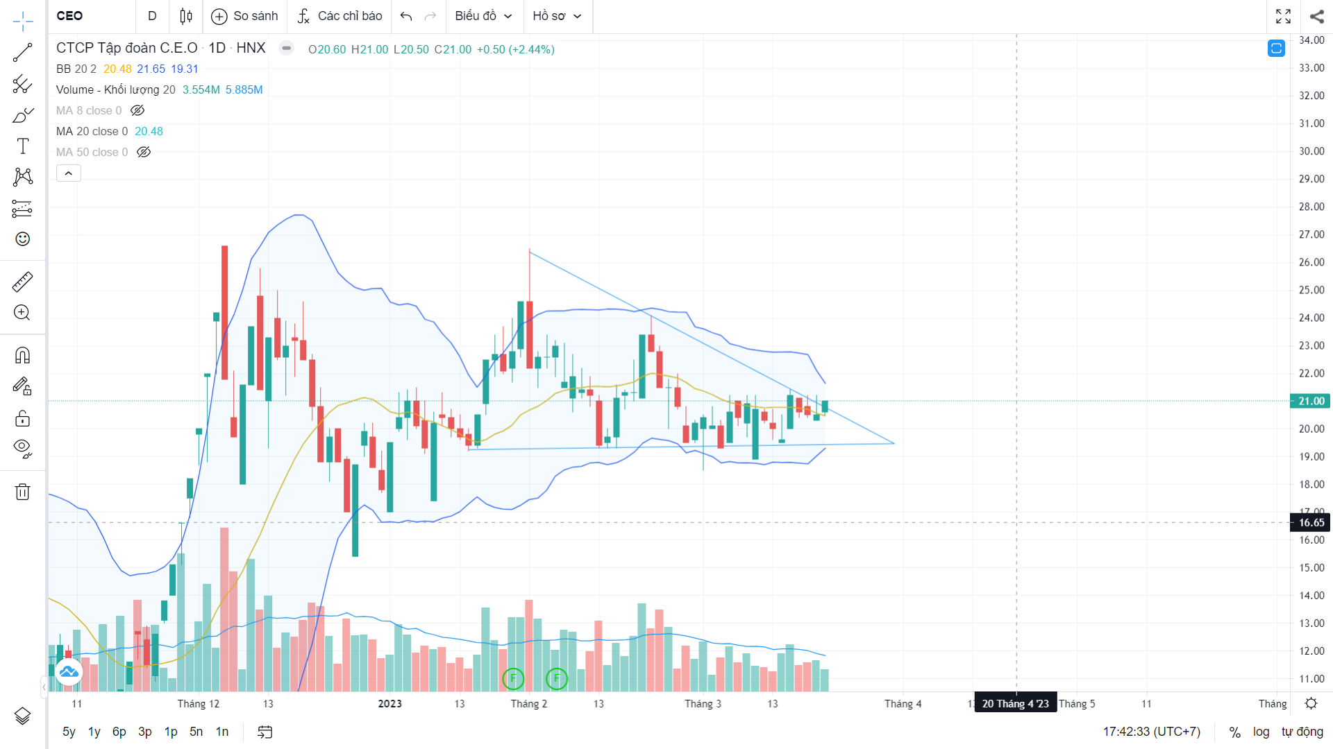 break hướng lên mẫu hình tam giác cộng với BB đang co lại cho thấy CEO sắp với 1 xu hướng mới