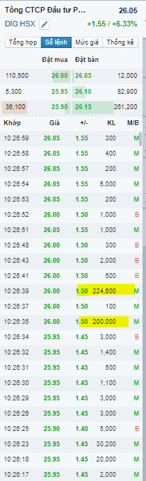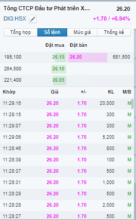 DIG 9h15 ATO khớp 54k, giá 25 tăng 0.5 điểm xanh. Chỉ báo tính hiệu ngày xanh. Giá trần hôm nay là 26.2; tham chiếu 24.5; sàn 22.8. Đã rất lâu rồi, mấy trăm ngày rồi DIG không biết đến trần là gì.