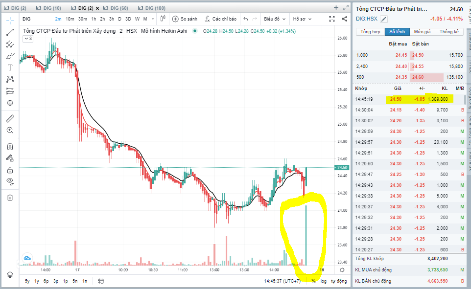 14h45 - DIG kết phiên 24.5, ATC khối lượng 1.4 tr. Hình như là nó đã theo kịch bản nào đó của ai đó?