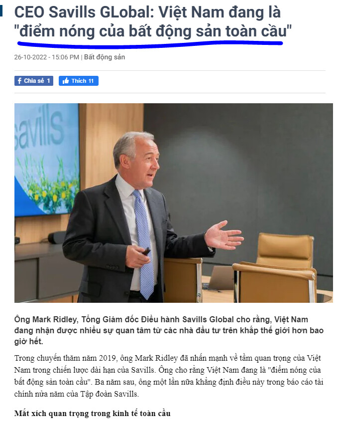 “Thị trường bất động sản Việt Nam có rất nhiều tiềm năng trong việc thu hút vốn đầu tư nước ngoài bởi tốc độ phát triển nhanh nhất khu vực Đông Nam Á, với nhiều lợi thế. Giá đất cũng ở mức cạnh tranh so với nhiều nước trong khu vực”