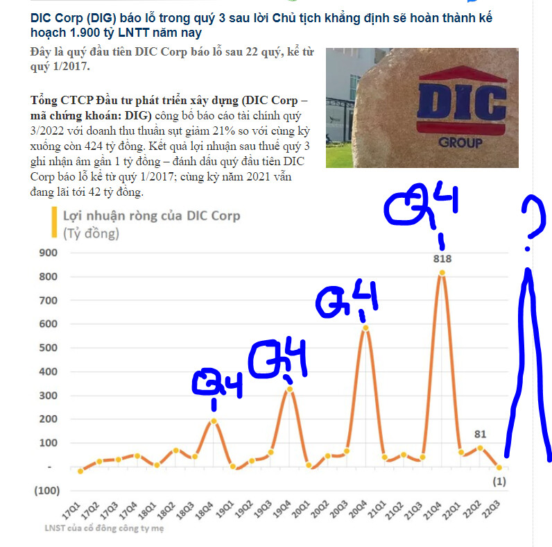 Trong 4 năm qua, 2018, 2019, 2021 thì DIG chỉ lãi duy nhất vào Quý 4. Điều này đã THÀNH QUY LUẬT. Nên năm 2022 sẽ không nằm ngoài quy luật đó. Biểu đồ dữ liệu đã nói lên cái quy luật này. Đây là một điều mà cổ đông có thể nhìn về tháng 11 và 12 với sự lặng lẽ, quan sát và chiêm nghiệm để kiểm định một điều gì đó về dữ liệu.