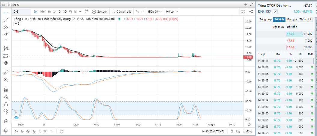 14h45, DIG đã có một cái kết thúc nghiện ngã, đắng cay nhất trong lịch sử khi về 17.7. Những giọt nước tè dầm cuối cùng của nhỏ lẻ đã hết rồi mà cá mập vẫn còn tiếp tục đạp để cho nó bốc hơi khai ùm lên. em CEO cùng lớn lên và cùng rơi xuống đáy đã xanh và tăng 0.8. DIG thì chưa được như thế.