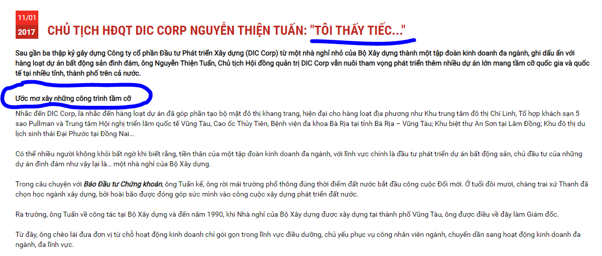 ông Tuấn tự tin, DIC Corp sẽ khẳng định được vị thế riêng trên thị trường, bởi Công ty sở hữu nhiều lợi thế. Đó là kinh nghiệm đầu tư xây dựng phát triển các dự án đô thị, kinh doanh bất động sản và dịch vụ du lịch; hiểu biết về địa phương sâu sắc; tầm nhìn dài hạn trong các lĩnh vực hoạt động cùng với đội ngũ 5.000 nhân viên có năng lực chuyên môn tốt.