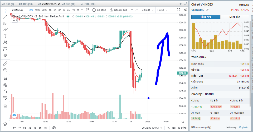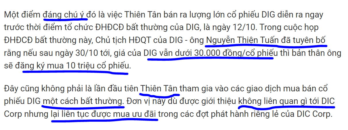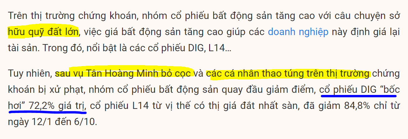 Lý do DIG lên là vì cái gì? Vì sở hữu quỹ đất lớn. Vậy lý do DIG bốc hơi 72.2% là vì cái gì? Vì vụ Tân Hoàng Minh bỏ cọc, vì các các nhân thao túng bị xử phạt. Lẽ ra DIG lên vì cái gì thì phải bốc hơi vì cái đó. Lên vì quỹ đất lớn thì phải bốc hơi vì quỹ đất đã bị nhỏ lại. Vậy logic lên xuống ở đây là khác nhau. Chờ quan sát tiếp xem còn có logic gì khác nữa liên quan không.