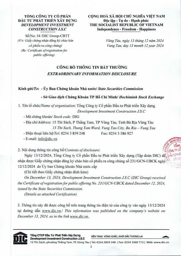 Theo thông báo của Ủy ban Chứng khoán Nhà nước (UBCKNN), cơ quan này đã cấp giấy chứng nhận đăng ký chào bán cổ phiếu ra công chúng số 231/GCN-UBCK ngày 12/12/2024 cho CTCP Đầu tư Phát triển Xây dựng (DIC Corp, MCK: DIG, sàn HoSE). Theo đó, công ty đăng ký chào bán thêm 200 triệu cổ phiếu ra công chúng.