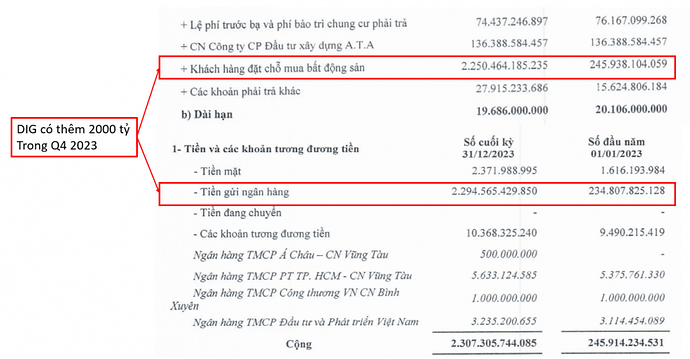 Q4 2023, DIG báo lãi 66 tỷ, đặc biệt DIG có thêm 2250 tỷ tiền khách hàng đặt chỗ mua BĐS, từ đó giúp cho dòng tiền của doanh nghiệp dồi dào hơn.