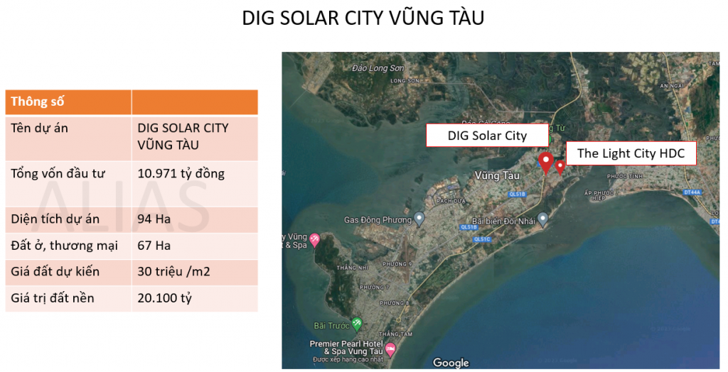 Không chỉ có quỹ đất đẹp vùng ven thành phố Hồ Chí Minh, DIG còn có quỹ đất ở khu vực trung tâm Vũng Tàu. Dự án DIG Solar City nằm ngay ở vị trí giao nhau giữa đường đôi Hai Tháng Chín và đường đôi Ba Tháng Hai tại trung tâm Vũng Tàu. Riêng giá trị đất nền là 20.100 tỷ, chưa kể thặng dư từ các tòa chung cư.