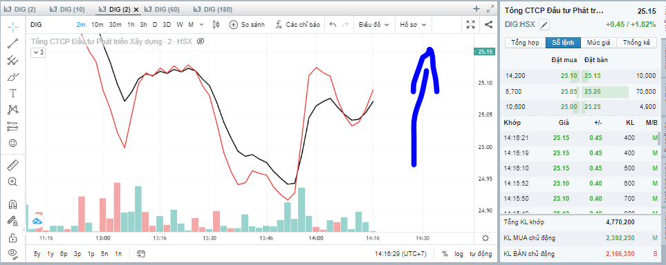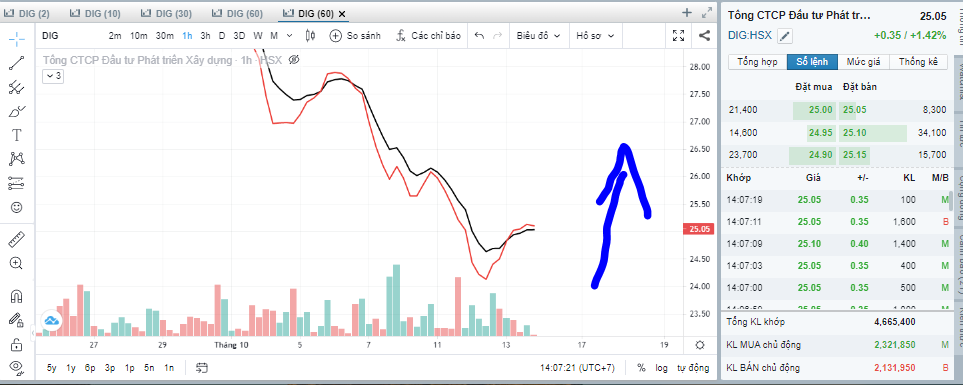 DIG phi lên nào. Cập nhật lúc 2 giờ chiều 13.10.2022. DIG đang có giá 25.05; tổng khối lượng khớp là 4.655.000 cổ phiếu.