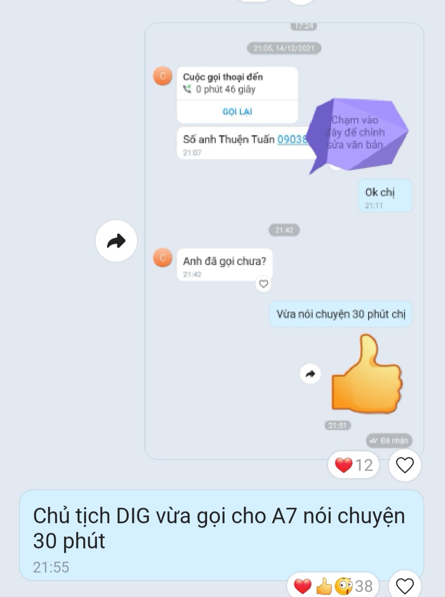 Thông tin lúc nửa đêm cho các ae cổ đông DIG chủ tịch Thiện Tuấn vừa điện cho A7 nói chuyện 30 phút chủ tịch muốn truyền đạt những thông điệp cho ae cổ đông nắm giữ DIG là sắp tới rất khủng khiếp.