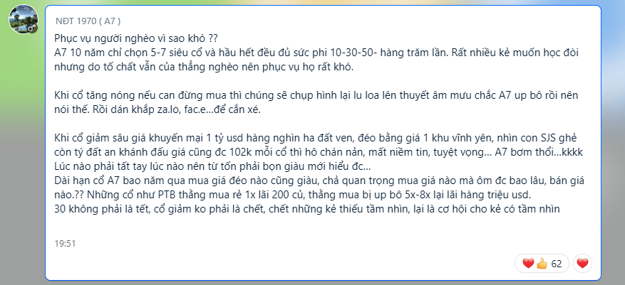 Lúc cả xã hội fomo múc vào chẳng chết! Cái đó là do kinh nghiệm non kém thôi. Tự kiểm điểm bản thân mà rút kinh nghiệm. Hàng ngon thì lại về bờ! M múc mấy con như phân bón bây giờ mà kẹp là nát bi 10 năm k về nổi bờ đâu!