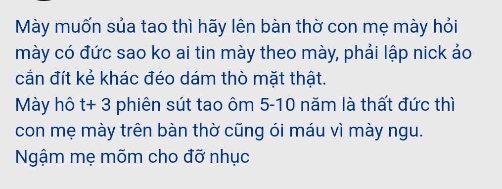 Đây con mẹ mày lòi cái mặt đây hèn hạ. Loại mày cặn bã xã hội. Lần sau cúng cứt lên bàn thờ cmm nhá cúng cơm nó phí