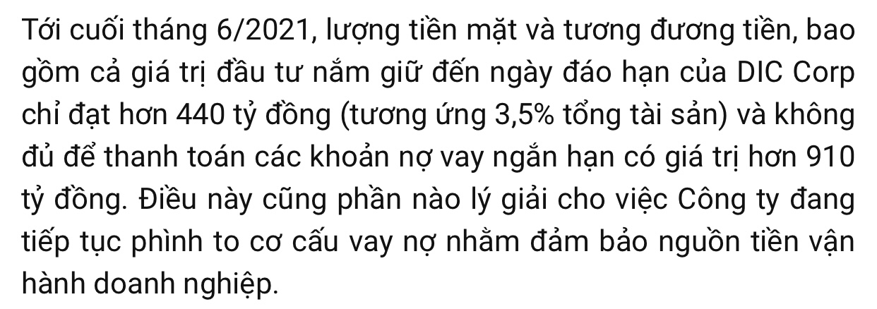 quote một cái như này là đủ biết ko hiểu gì về tài chính doanh nghiệp, đặc biệt là doanh nghiệp bất động sản :)) Cứ capture một thời điểm cứ thấy dư tiền mặt + tương đương tiền + tiền gửi có kỳ hạn < nợ vay đến hạn phải trả là kết luận luôn doanh nghiệp mất thanh khoản, ấu trĩ quá : ))))