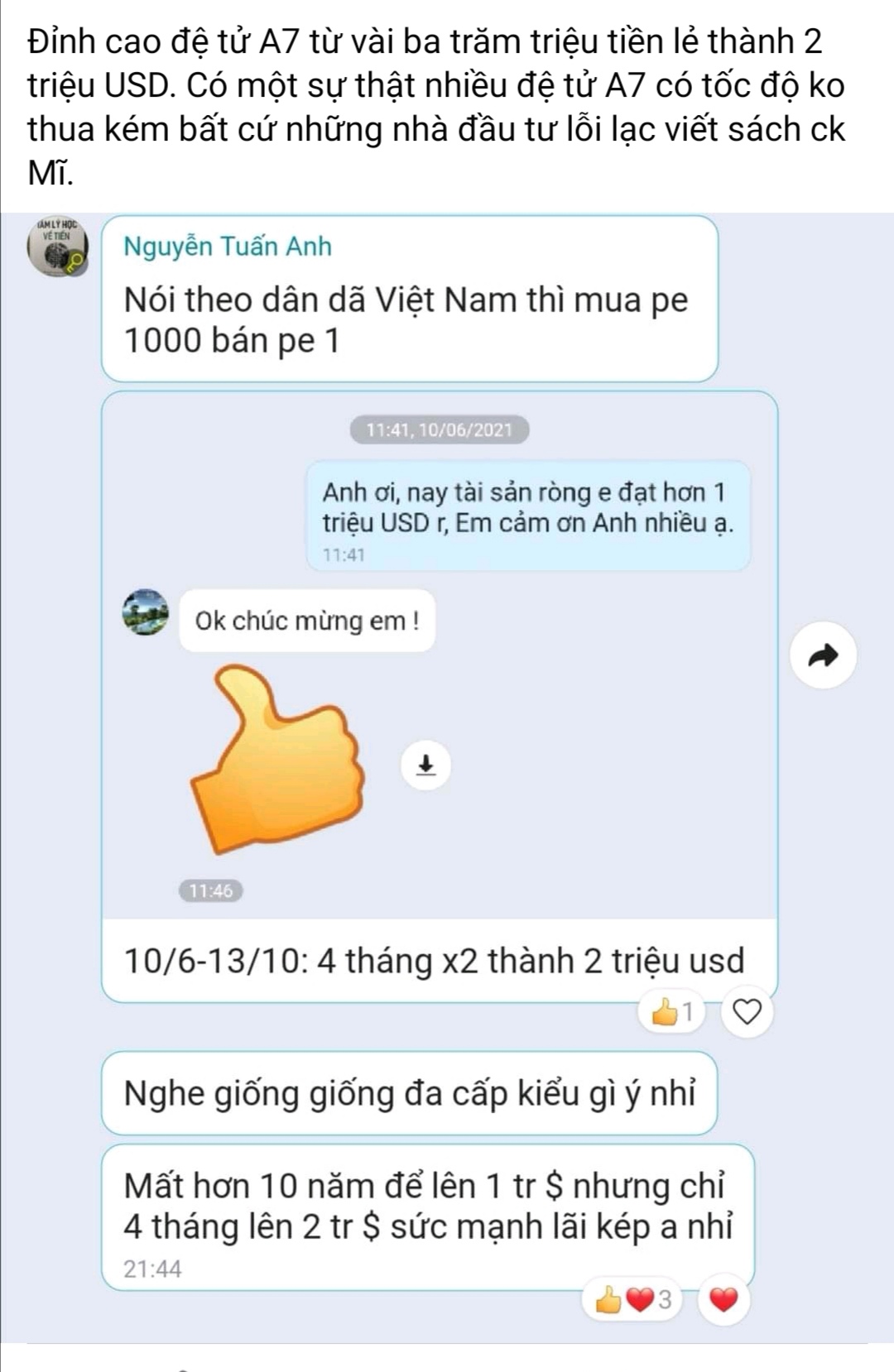Cuộc đời luôn như thế! luôn có những lức tưởng tuyệt vọng đến tận cùng nhưng lại mở ra trang khác sáng hơn " Vật cùng tắc biến, vật cực tất phản". Nếu ngày ấy a7 xúc biệt thự Văn Quán thì công ty in của a7 không phá sản, rất có thể ngày nay sẽ có một ông chủ xưởng in kiêm nhà đầu tư BĐS chứ không phải a7 như bây giờ. A7 bây giờ là kỳ nhân của CKVN không chỉ giúp bản thân giàu có mà còn dìu dắt, giúp đỡ nhiều anh em, đệ tử trở nên giàu có với triết lý đầu tư " Thiên thời" dễ hiểu nhưng thâm sâu.