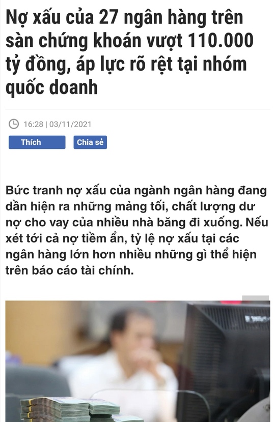 Bản thân em đang làm ngân hàng nên em hiểu rõ lắm thầy. Bong bóng ngân hàng cực nguy hiểm, đang chạy nước rút để chống nổ nợ xấu. Quả bom nguyên tử nợ xấu.
