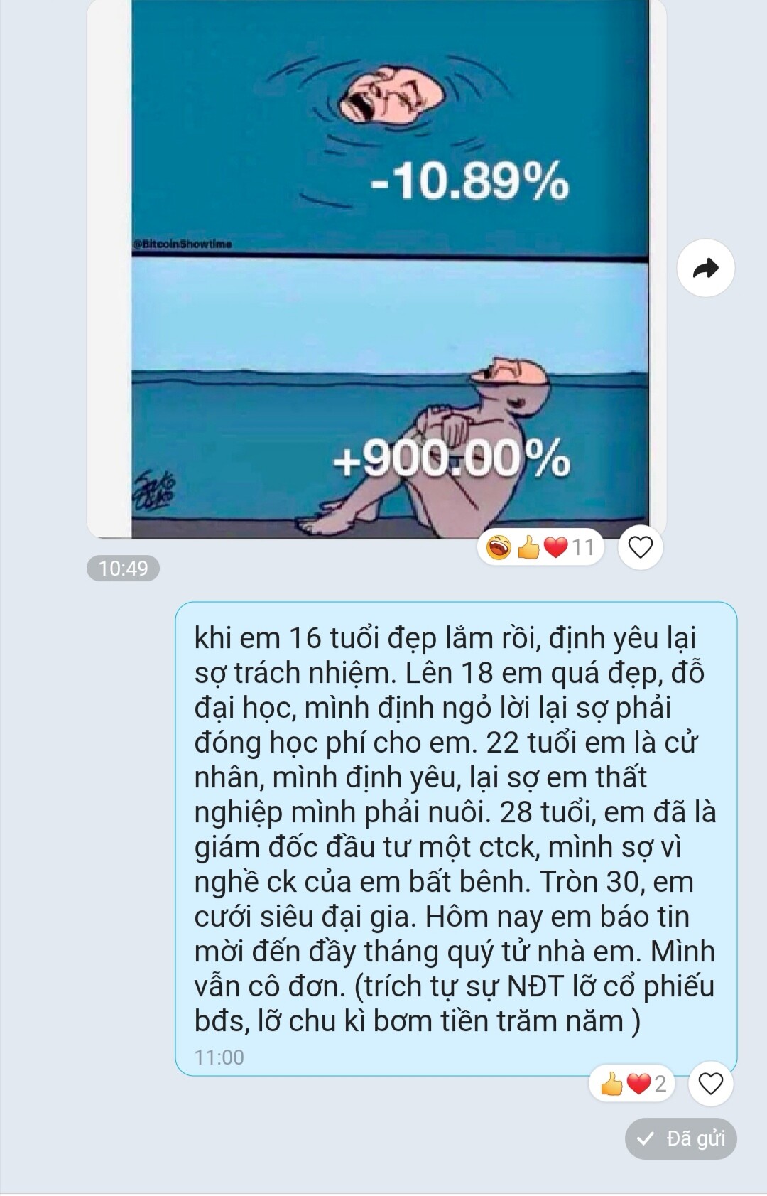 khi em 16 tuổi đẹp lắm rồi, định yêu lại sợ trách nhiệm. Lên 18 em quá đẹp, đỗ đại học, mình định ngỏ lời lại sợ phải đóng học phí cho em. 22 tuổi em là cử nhân, mình định yêu, lại sợ em thất nghiệp mình phải nuôi. 28 tuổi, em đã là giám đốc đầu tư một ctck, mình sợ vì nghề ck của em bất bênh. Tròn 30, em cưới siêu đại gia. Hôm nay em báo tin mời đến đầy tháng quý tử nhà em. Mình vẫn cô đơn. (trích tự sự NĐT lỡ cổ phiếu bđs, lỡ chu kì bơm tiền trăm năm )