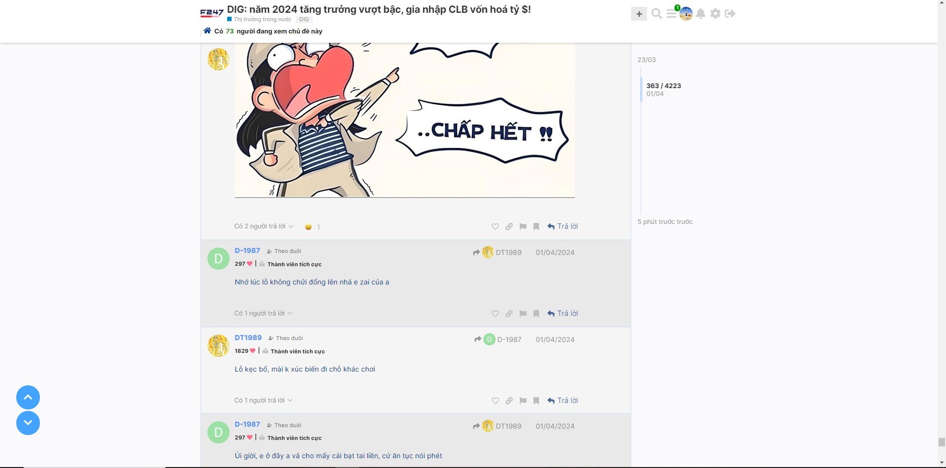 Chú em càng nói càng thấy nghiệp, ko chỉ rieng DIG, bat kề cp nào, nếu đã thua cp thi rut kinh nghiêm, mình chơi mình chịu. Đừng để lúc mê mụi cp thì keu muc, luc thua nang cutloss lai quay xe chửi DN hay ai đó, mà ko chịu công nhận là do mình tự quyết.