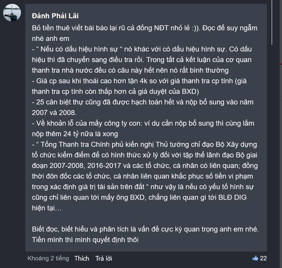 Trách nhiệm thuộc về ai, ở giai đoạn nào thì người đó chịu cụ ạ. Trong kết luận cũng ghi rất rõ, trách nhiệm thuộc về những ai, phải làm những gì để khắc phục. Còn cụ cố lờ đi mấy cái đó mà đổ trách nhiệm lên DIG thì không phải rồi.