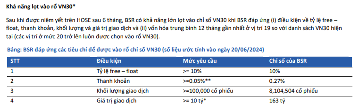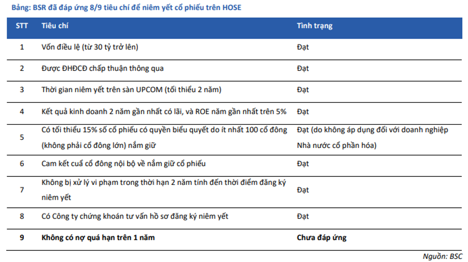 Một doanh nghiệp khi chuyển lên sàn HOSE sẽ phải đáp ứng đầy đủ các điều kiện và hiện BSR đã đáp ứng được 8/9 điều kiện chuyển sàn và 100% điều kiện của rổ cổ phiếu VN30.
