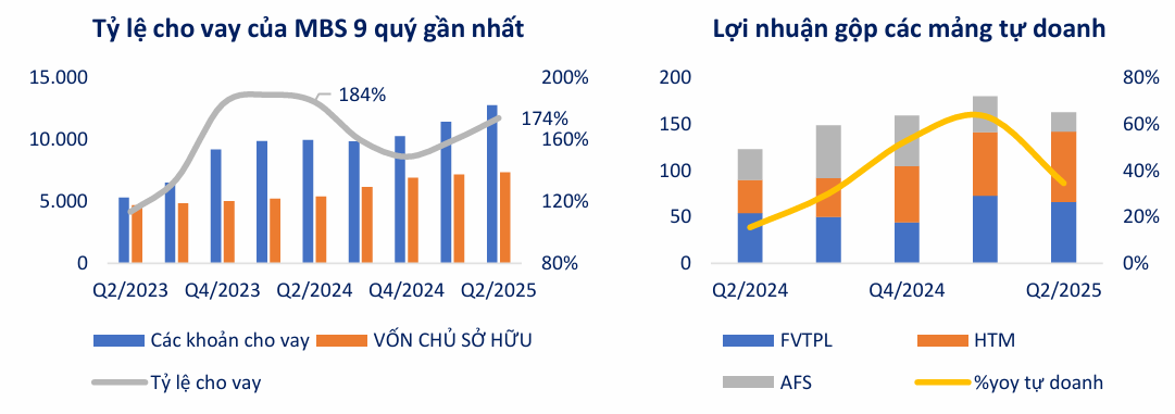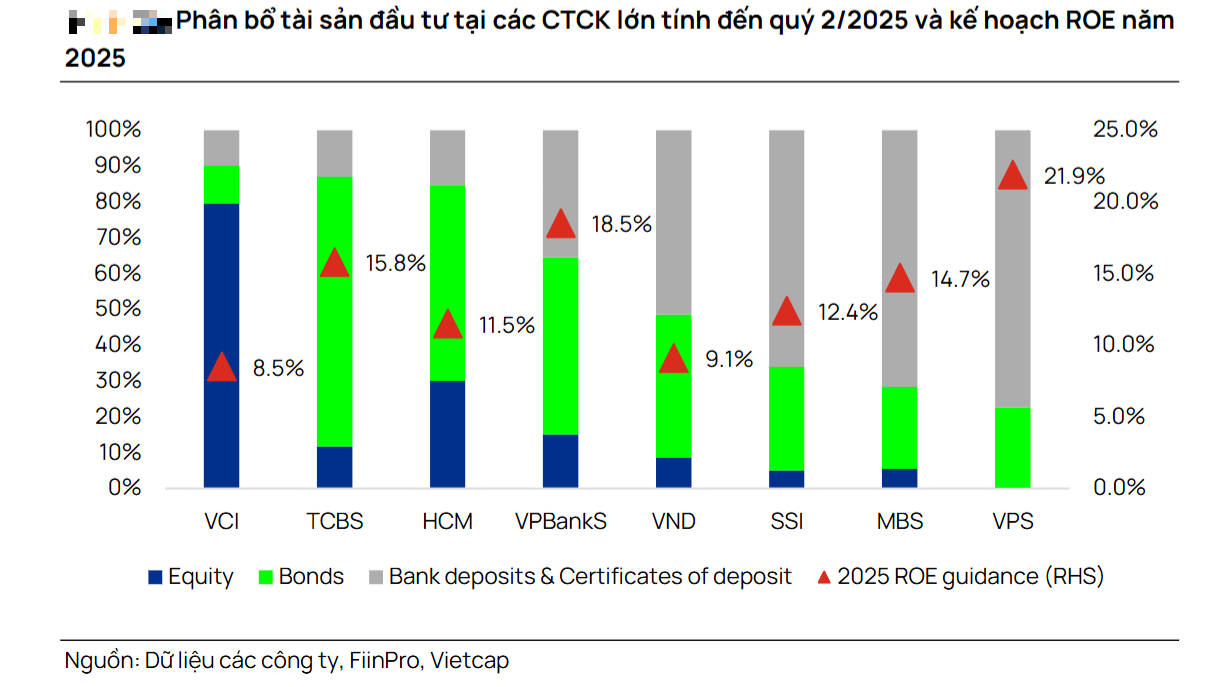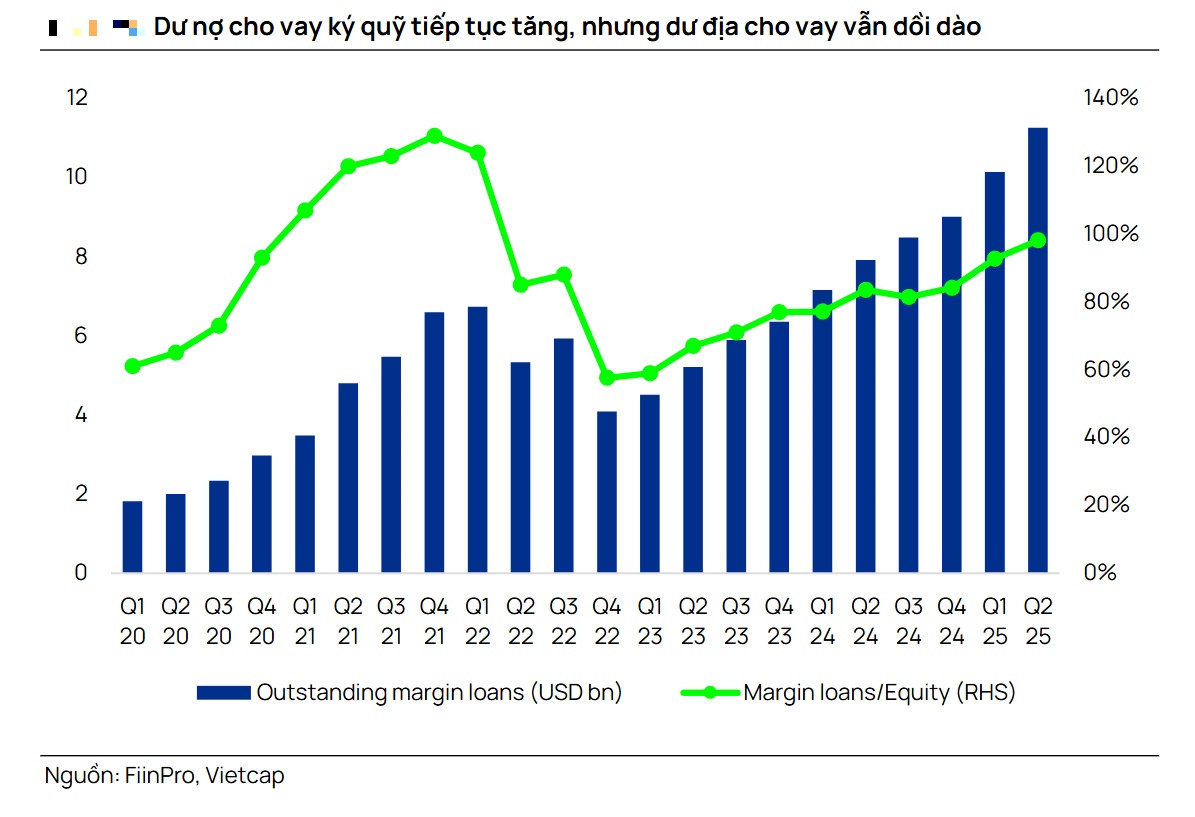 Ngược lại, 5 CTCK độc lập lớn, bao gồm SSI, HCM, VCI, VND và VPS, đã báo cáo tổng dư nợ cho vay ký quỹ là 3,2 tỷ USD vào cuối quý 2/2025, tăng với CAGR 41% so với mức 1,5 tỷ USD vào năm 2022. Tổng thị phần của nhóm CTCK này đã giảm từ 33% vào năm 2022 xuống 30% vào cuối quý 2/2025. Chúng tôi cho rằng hiệu suất vượt trội của các CTCK được hậu thuẫn bởi ngân hàng trong mảng cho vay ký quỹ là nhờ lợi thế về bảng cân đối kế toán quy mô lớn và nguồn vốn, và chúng tôi kỳ vọng xu hướng này sẽ tiếp tục trong tương lai gần.