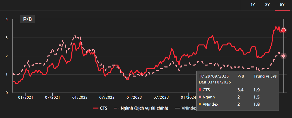 - Cuối cùng, CTS đang có mức định giá đã vượt đỉnh năm 2021 ở mức P/B 3.6 cũng khá hợp lý và có phần hơi đắt khi so với các công ty có cùng mức vốn chủ sở hữu và cơ cấu lợi nhuận. Do đó nhà đầu tư có thể đưa ra quyết định mua bán phù hợp với thị trường chung để quản lý rủi ro với những cổ phiếu này.