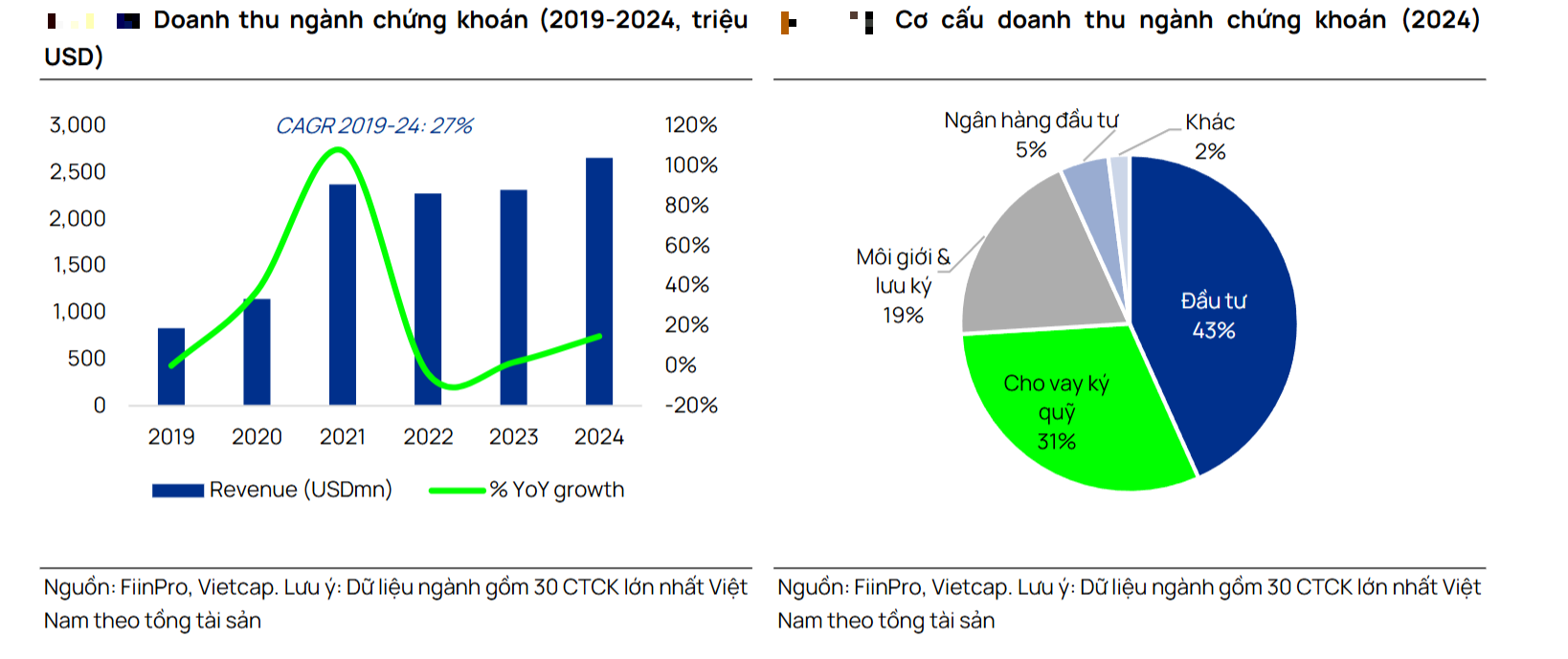 Thị trường tiềm năng cho ngành chứng khoán đã tăng trưởng mạnh mẽ cùng với sự phát triển của các thị trường tài chính Việt Nam. Dựa trên phân tích của chúng tôi về 30 công ty chứng khoán (CTCK) lớn nhất tại Việt Nam theo tổng tài sản, tổng doanh thu của ngành này đã tăng hơn gấp 3 lần trong giai đoạn 2019-2024, đạt 2,7 tỷ USD vào năm 2024 (CAGR 27%). Về cơ cấu doanh thu, các CTCK tạo ra phần lớn doanh thu từ hoạt động đầu tư (43% doanh thu năm 2024) và hoạt động cho vay ký quỹ (31%). Trong khi đó, doanh thu từ dịch vụ môi giới & lưu ký (19%) và dịch vụ ngân hàng đầu tư (5%) chiếm tỷ trọng nhỏ hơn trong tổng doanh thu.