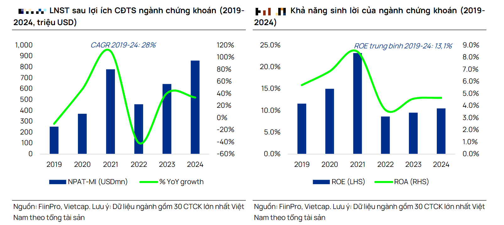 Không chỉ ghi nhận tăng trưởng doanh thu mạnh mẽ và bảng cân đối kế toán mở rộng đáng kể trong những năm gần đây, các CTCK còn đạt được tăng trưởng lợi nhuận vượt trội qua các chu kỳ thị trường. Trong giai đoạn 2019-2024, 30 CTCK lớn nhất theo tổng tài sản đã đạt CAGR tổng lợi nhuận là 28% và tổng lợi nhuận của các CTCK đã đạt 860 triệu USD vào năm 2024. Tổng ROE của các CTCK đã đạt mức cao hơn 23% trong chu kỳ tăng giá vào năm 2021.