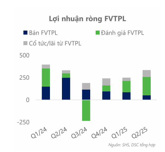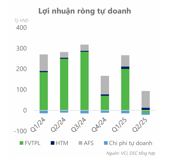 Đi ngược lại với số đông, danh mục tự doanh của VCI trong quý 2 lại không mấy khả quan. Cụ thể, VCI ghi nhận mức lãi bán tài sản tài chính FVTPL là 580 tỷ, tuy nhiên không đủ để bù lại mức lỗ bán âm 645 tỷ. Điều này dẫn đến việc lợi nhuận ròng tự doanh quý vừa qua chỉ đạt 81 tỷ (-71% YoY), giảm mạnh so với cùng kỳ năm ngoái.