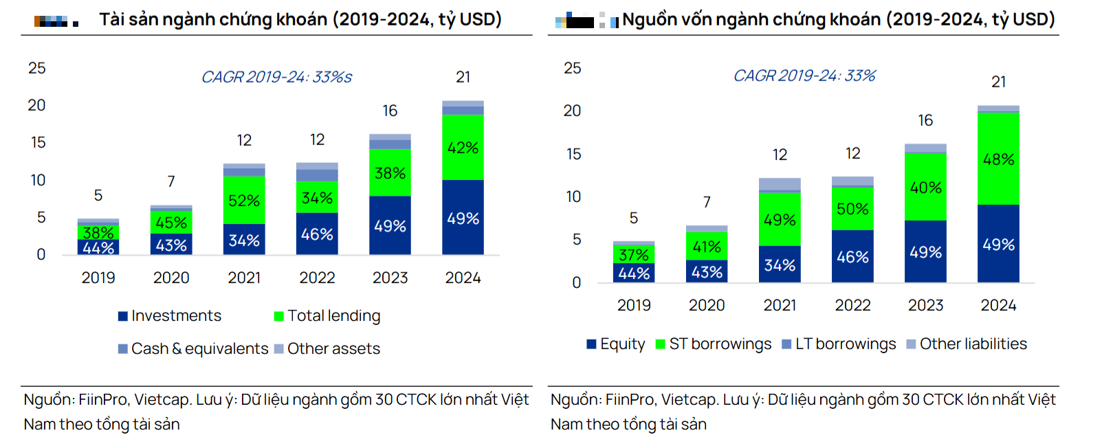 Bảng cân đối kế toán của các CTCK đã mở rộng đáng kể trong những năm gần đây khi ngành môi giới đã trở thành một trung gian tài chính quan trọng cho nền kinh tế bên cạnh ngành ngân hàng. Tổng tài sản của 30 CTCK lớn nhất tại Việt Nam đã tăng hơn gấp 3 lần trong giai đoạn 2019-2024, đạt 21 tỷ USD vào năm 2024 (CAGR 33%). Đầu tư và cho vay chiếm phần lớn tài sản của ngành, lần lượt là 49% và 42% (dữ liệu năm 2024). Về nguồn vốn, gần 50% nguồn vốn của ngành chứng khoán đến từ vốn chủ sở hữu của cổ đông. Phần còn lại chủ yếu đến từ các khoản vay ngắn hạn (48% tổng nguồn vốn) từ các ngân hàng thương mại, được sử dụng để tài trợ cho các hoạt động cho vay ký quỹ.