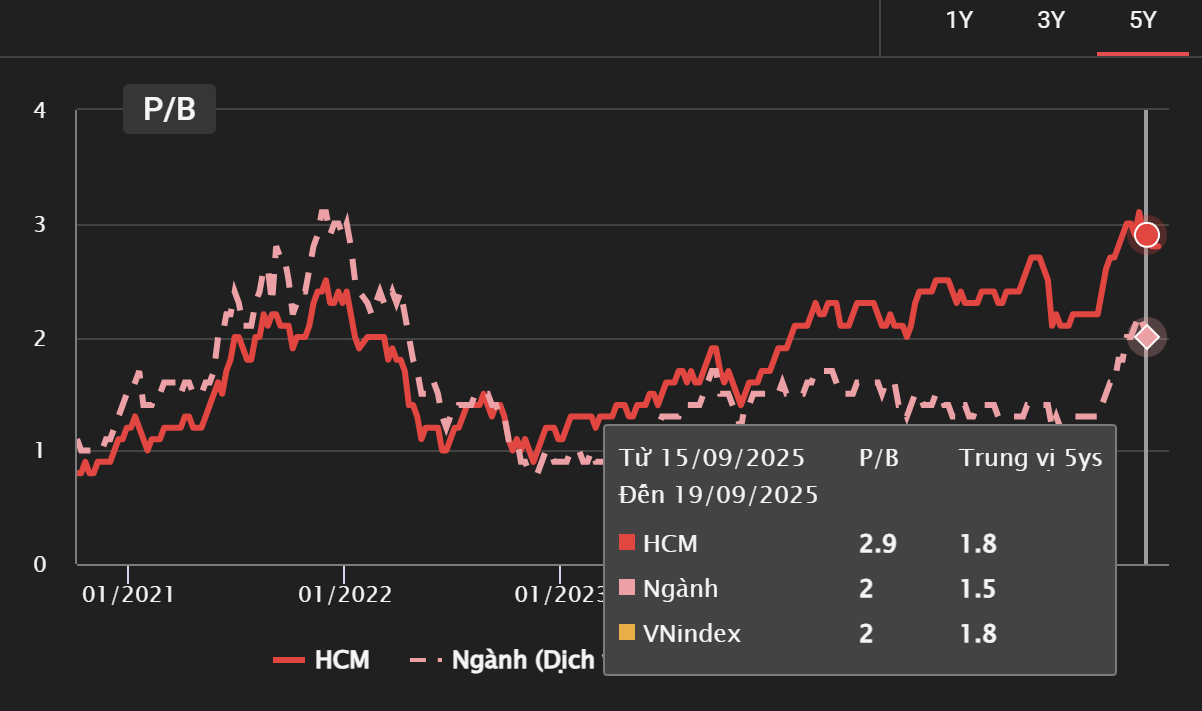 - Giống với VCI, hiệu quả đầu tư của HCM có sự suy yếu trong quý 2 khi hoạt động bán các tài sản tài chính ghi nhận khoản lỗ ròng 101 tỷ, tương tự khoản chênh lệch đánh giá lại tài sản cũng ghi nhận âm 20 tỷ. Điểm sáng duy nhất là sự tăng mạnh của phần cổ tức/lãi từ TSTC, đạt 228 tỷ (+521% YoY), chủ yếu do HCM tăng đáng kể khoản đầu tư vào các tài sản thu nhập cố định. Cụ thể lượng trái phiếu ngân hàng trong danh mục tăng thêm gần 2.000 tỷ so với quý trước, lượng chứng chỉ tiền gửi cũng tăng thêm 2.000 tỷ. Động thái này không chỉ củng cố thêm độ an toàn cho danh mục mà còn mang lại nguồn thu ổn định cho HCM, giúp bù đắp lại khoản lỗ có thể xảy ra khi thị trường cổ phiếu biến động. Dư nợ cho vay của HCM đang có tín hiệu chững lại trong hai quý gần đây. Chúng tôi cho rằng bên cạnh áp lực cạnh tranh của các CTCK, việc quá trình tăng vốn chưa hoàn tất là nguyên nhân chính ảnh hưởng tới tăng trưởng dư nợ. Tỷ lệ dư nợ/VCSH liên tục ở sát mức trần khiến dư địa cho vay của HCM bị hạn chế kể từ Q3/2024. Dư nợ cho vay dự kiến sẽ tăng trở lại từ Quý 4 và tiếp tục là yếu tố quan trọng trong cơ cấu lợi nhuận của HCM. Với kỳ vọng nhiều về việc nâng hạng và nhu cầu đầu tư trong nước, ta hoàn toàn có thể kỳ vọng HCM có thể đạt ngưỡng định giá P/B 3.5, tương ứng với mức tăng 18,44% lên mức 33050 VNĐ/ cổ phiếu.