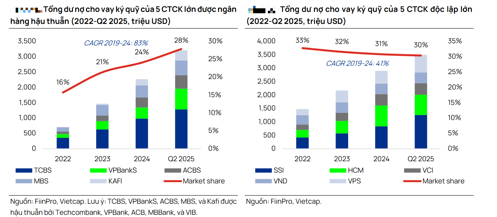 Trong bối cảnh nhu cầu vay ký quỹ đang tăng mạnh, một xu hướng chính của ngành mà chúng tôi đã chứng kiến trong những năm gần đây là các công ty chứng khoán được hậu thuẫn bởi ngân hàng đã giành được thị phần đáng kể từ các công ty chứng khoán độc lập. Để minh họa, tổng dư nợ cho vay ký quỹ của năm công ty chứng khoán lớn được hậu thuẫn bởi ngân hàng, bao gồm TCBS, VPBankS, ACBS, MBS và KAFI, đã tăng với tốc độ vượt dự kiến từ chỉ hơn 700 triệu USD vào năm 2022 lên 3,2 tỷ USD vào cuối quý 2/2025, tương ứng với CAGR là 83%. Tổng thị phần cho vay của nhóm CTCK này đã tăng từ 16% vào năm 2022 lên 28% vào cuối quý 2/2025.