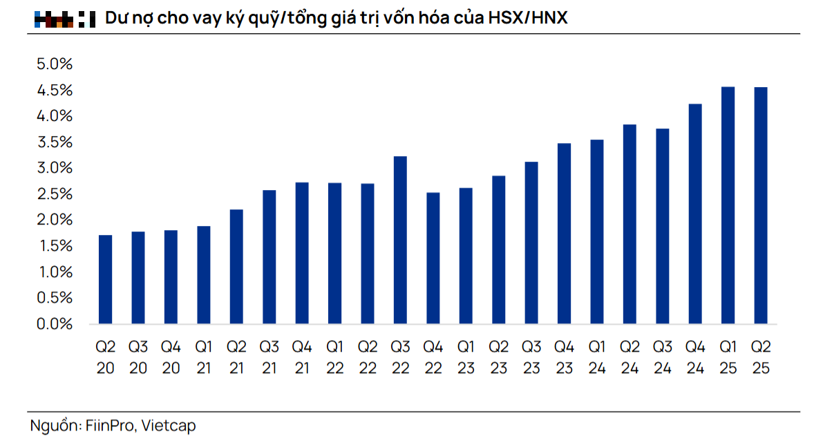 Đầu tiên, đối với mảng cho vay ký quỹ, chúng tôi nhận thấy nhu cầu cho vay ký quỹ đã tăng mạnh nhờ hoạt động thị trường sôi động. Tính đến quý 2/2025, tổng dư nợ cho vay ký quỹ toàn ngành đạt 297 nghìn tỷ đồng (+23,0% so với đầu năm và +40,0% YoY) và tương đương 4,6% tổng vốn hóa thị trường của 2 sàn HSX và HNX (chỉ các chứng khoán trên hai sàn này đủ điều kiện để cho vay ký quỹ). Tỷ lệ này đã tăng đều đặn qua các chu kỳ thị trường từ mức chỉ 1,7% cách đây 5 năm vào quý 2/2020, cho thấy nhu cầu vay ký quỹ từ các bên tham gia thị trường không chỉ phụ thuộc vào diễn biến của chỉ số mà còn mang tính cơ cấu hơn.