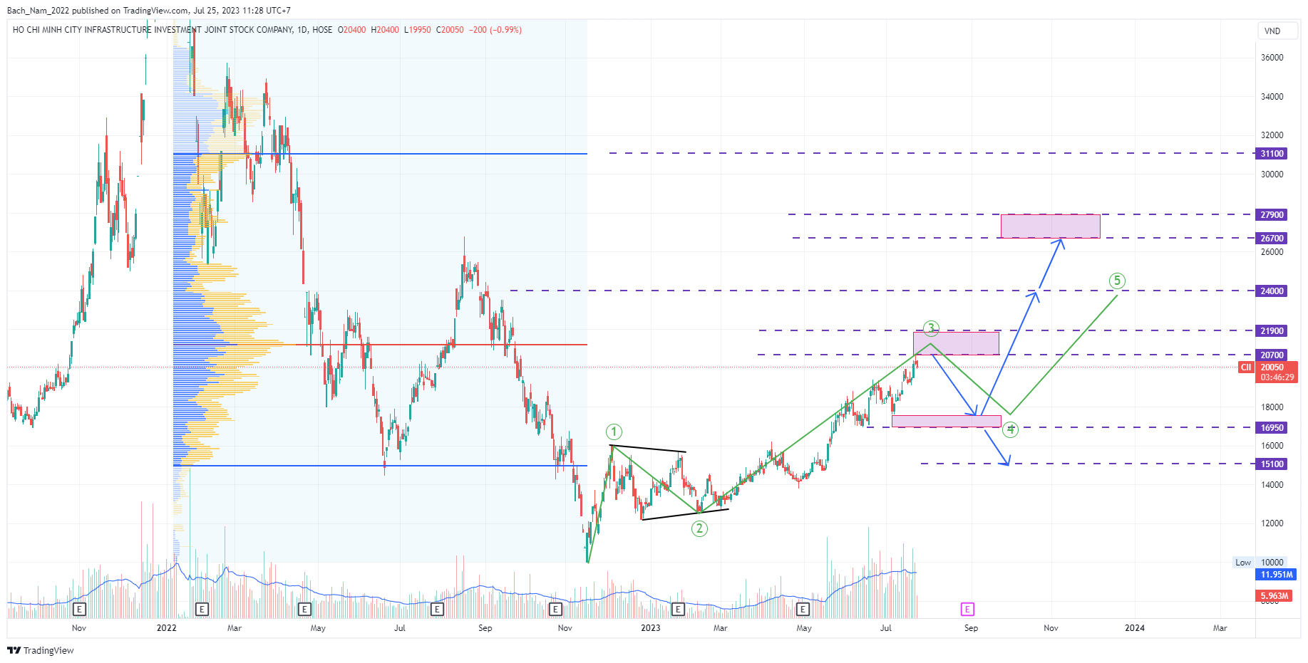 Nó đang có tín hiệu tích cực nhưng cần phải vượt qua khu 18-19k mới có thể lên sóng V được. Nếu lên sóng có mấy mục tiêu đánh dấu bên trên.