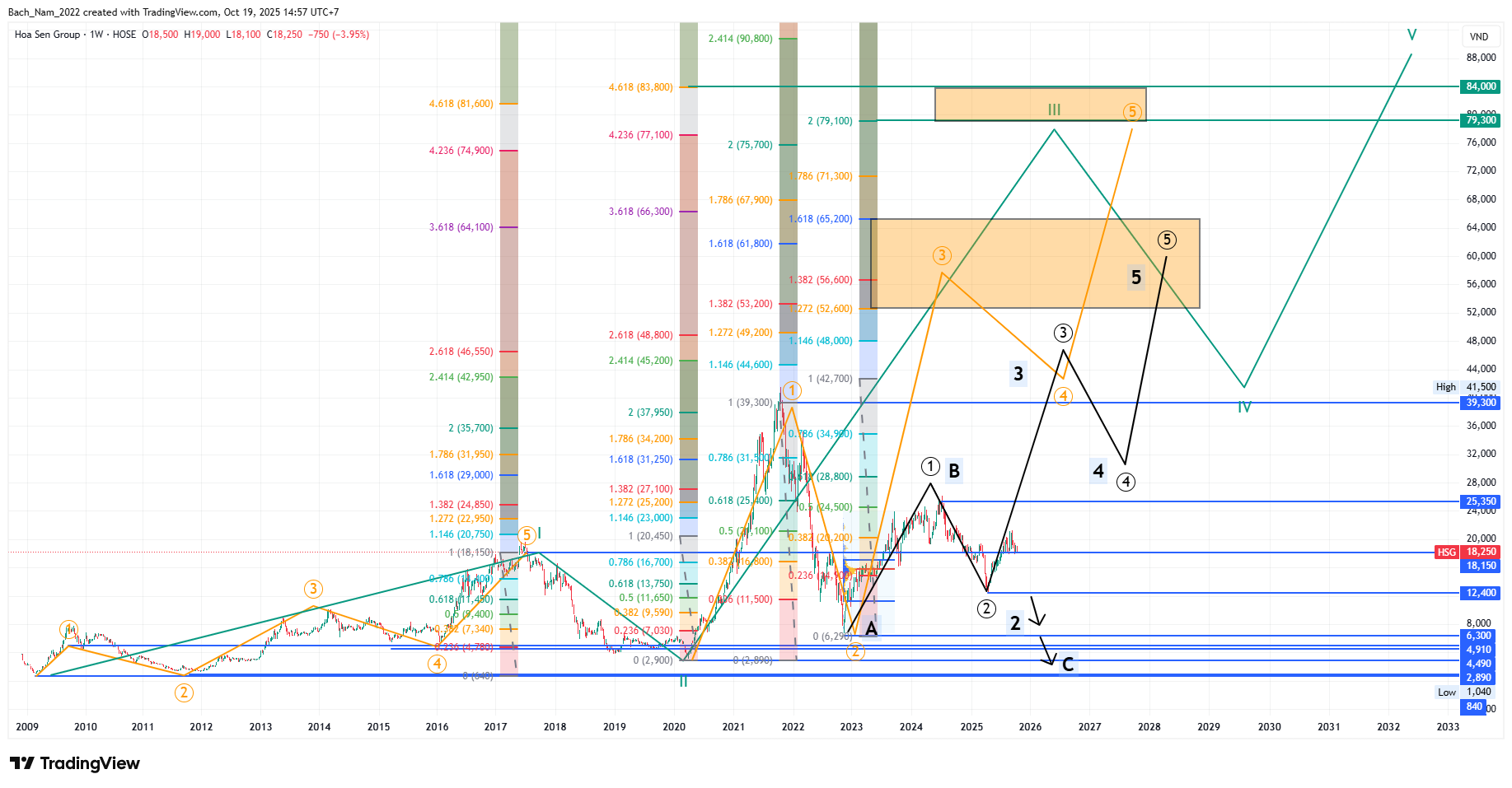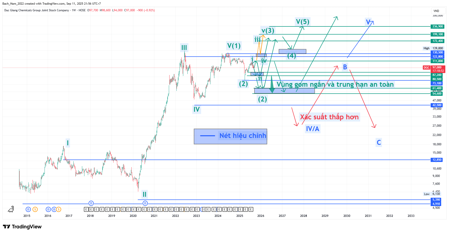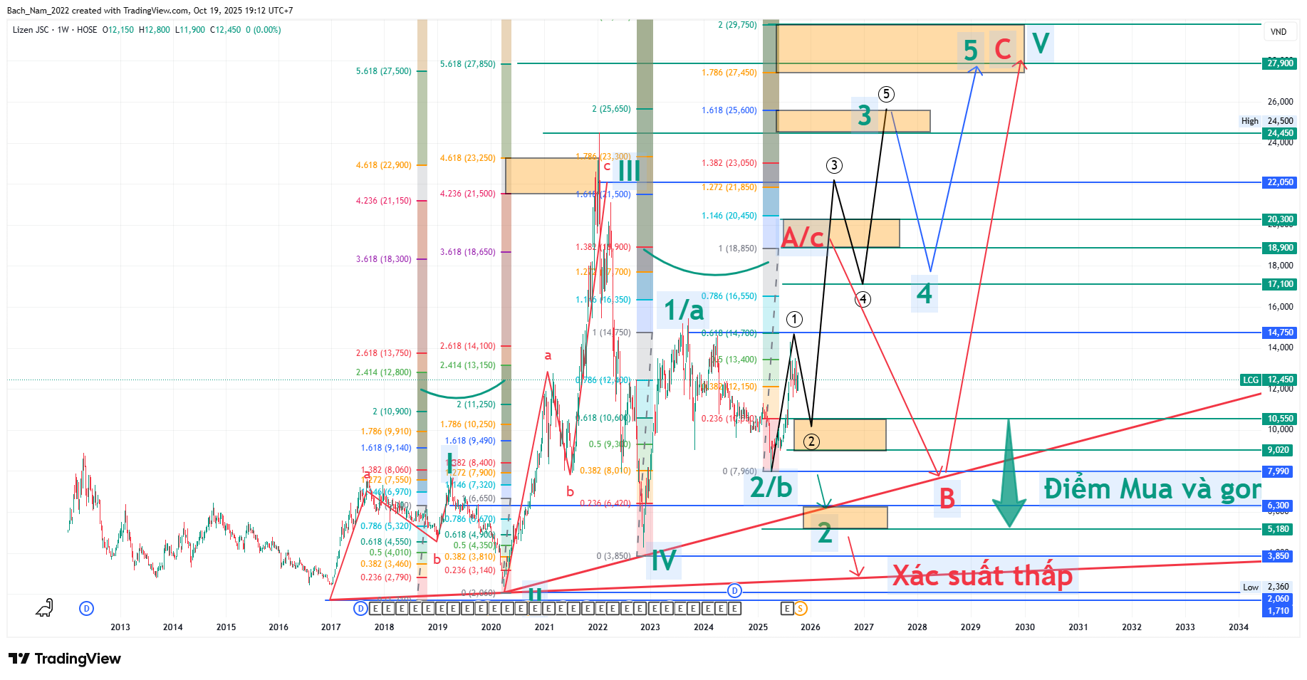 Em lính mới đọc chart không hiểu lắm, bác giải thích giúp em với: xác suất FPT từ điểm hiện tại lên 3 ở 125 so với về C/b/2 ở 72-65 thì cái nào khả thi hơn ạ?
