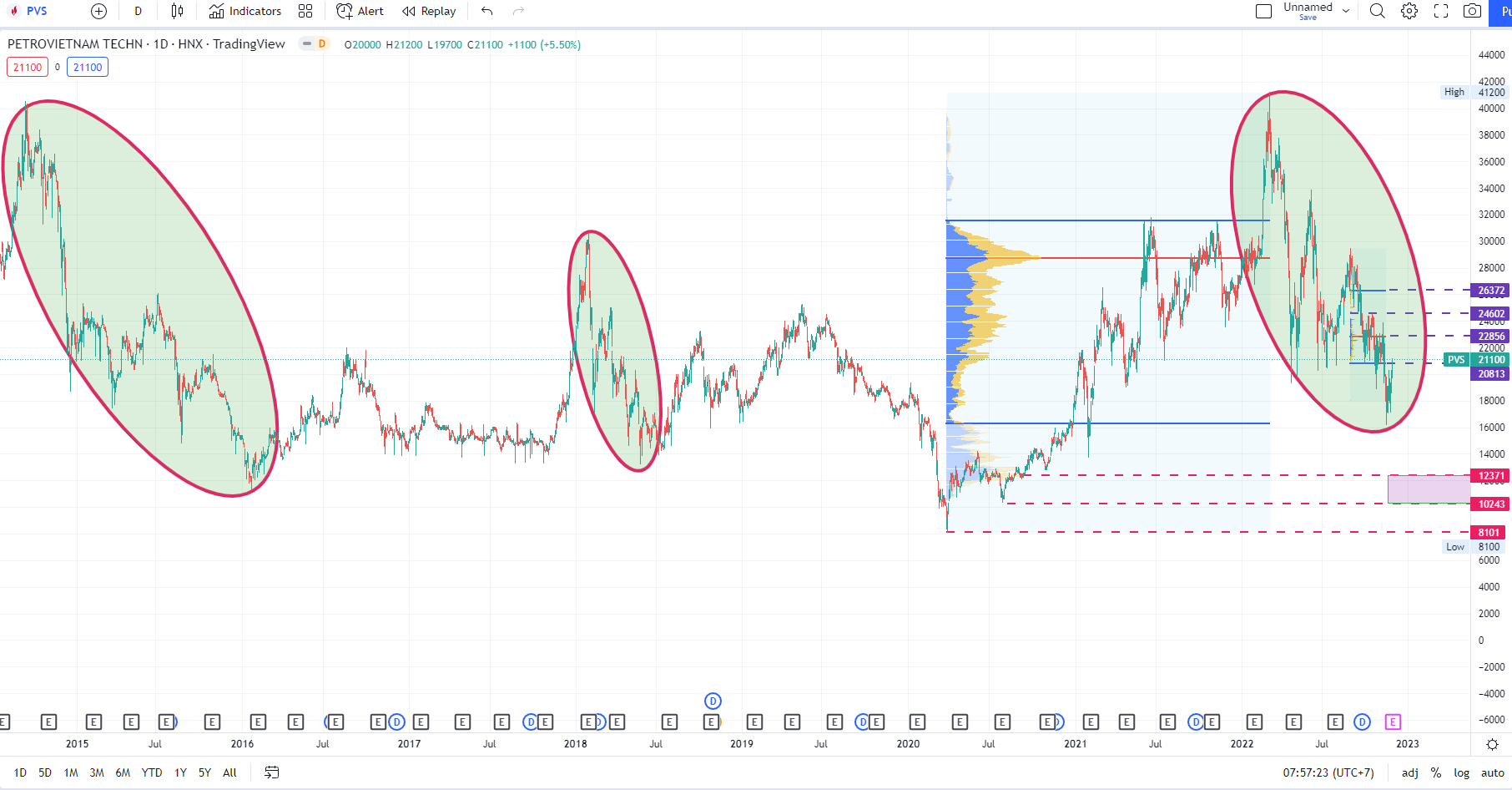Ngắn hạn thì mục tiêu khu 23-24k, dài hạn nên chờ khu vực quanh 10-12 để đầu tư vừa ăn cổ tức vừa chờ sự tăng giá cổ phiếu. Hãy xem giai đoạn từ đỉnh xuống của nó trong quá khứ, nó đang chạy sóng kiểu như 2014, 2018