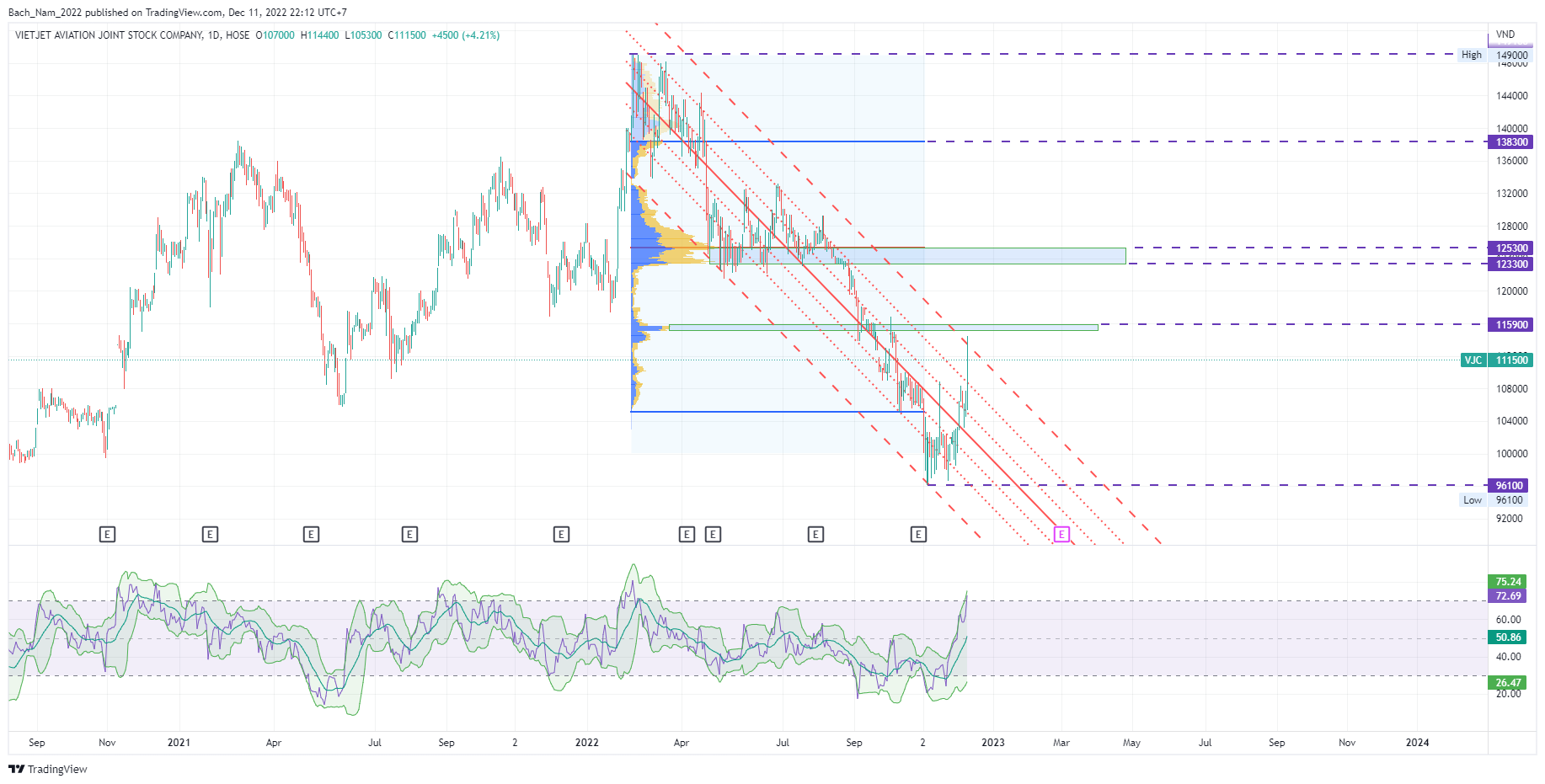 Vượt qua khu vực đó có mục tiêu chính khu 125k. Cơ bản nó đang ở sóng 3 (sẽ đi sóng 12345 và đang ở nhịp 1 nên chưa xác định chính xác được mục tiêu mà xem vùng giao dịch để dự đoán mục tiêu đã). Sóng 3 có thể là sóng mở rộng theo đường tím).