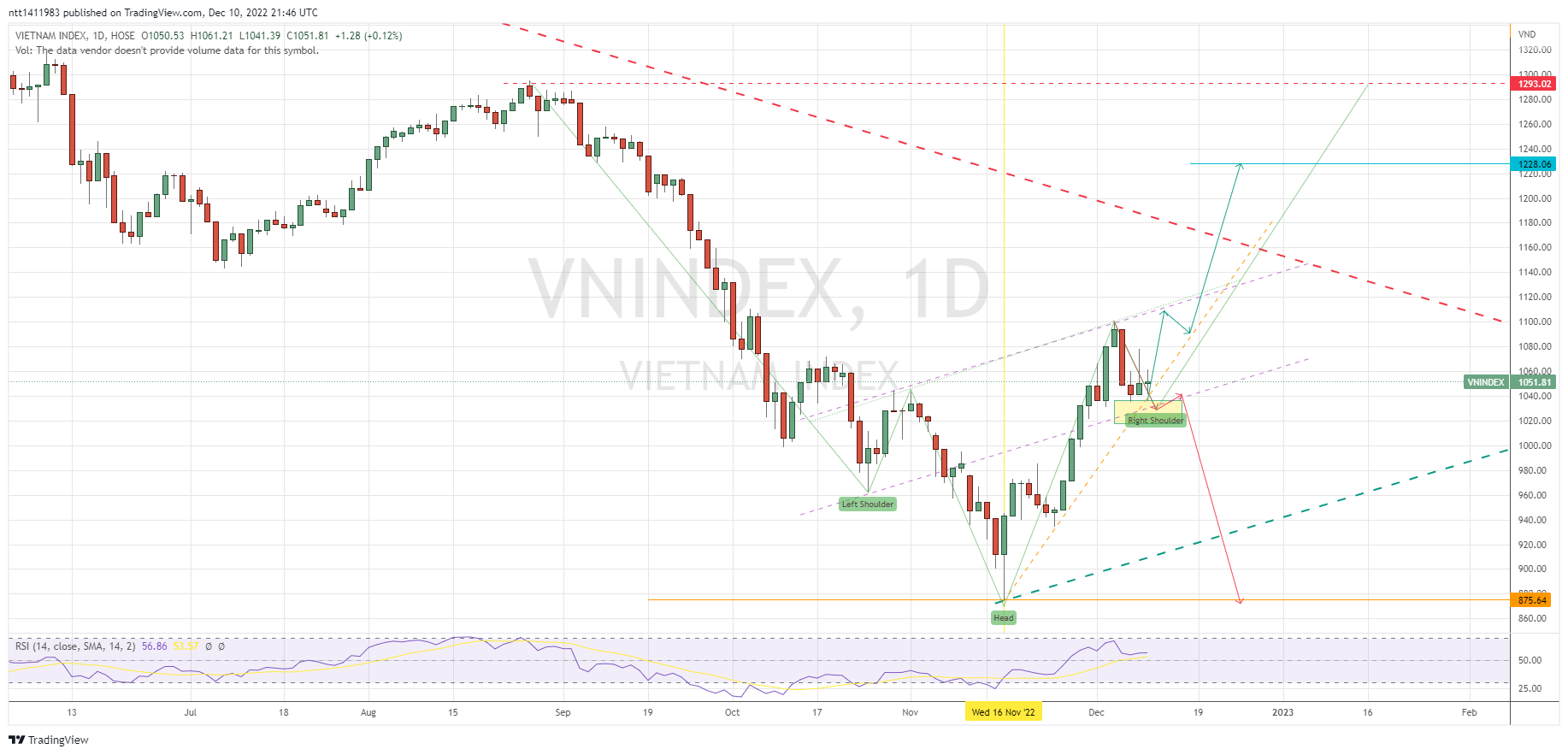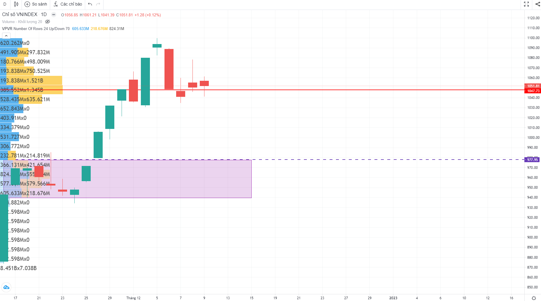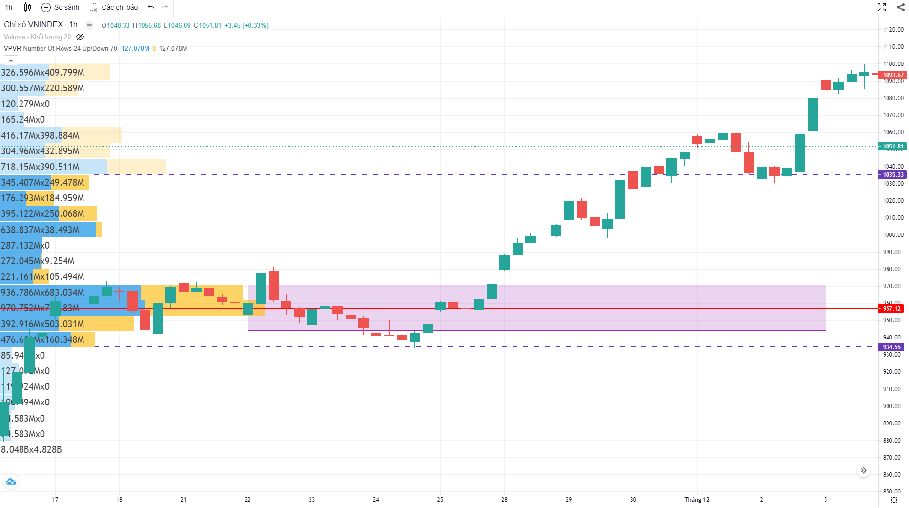 Nhìn tổng thể cả sóng từ 16/11 đến nay, hiện đang phân phối tích lũy vùng 1050 để tìm điểm cân bằng, một khi phân phối cơ bản mà không có lực vào (khi kéo) thì sẽ dẫn đến lực xả về vùng hỗ trợ dưới. Cấu trúc volume profile at price đang dạng chữ B là cấu trúc chưa rõ xu hướng