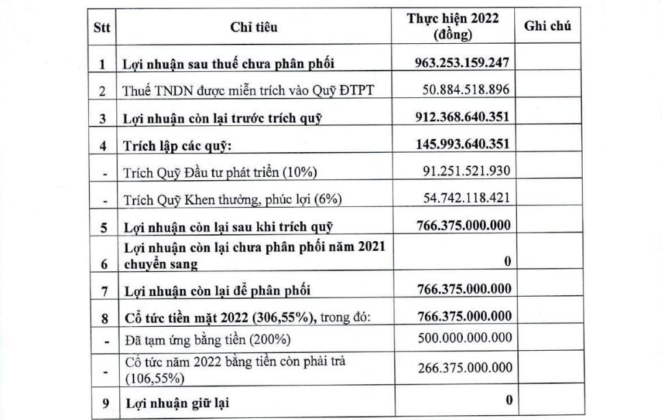 Mặc dù vậy, công ty vẫn còn phải trả thêm 266 tỷ đồng (tỷ lệ 106,55%) mới hoàn thành kế hoạch chi cổ tức bằn tiền đã duyệt cho năm 2022 (tổng tỷ lệ 306,55% - tương ứng số tiền 766,4 tỷ)