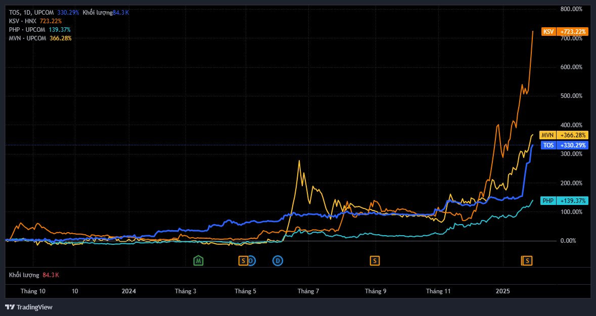 Bên cạnh những MCK trên, nhiều đại gia Nhà nước khác cũng góp mặt trong danh sách như VietinBank (CTG), PV GAS (GAS), GVR và mới nhất là VIMC (MVN). Cổ phiếu “ông trùm” ngành cảng và vận tải biển Việt Nam bứt phá mạnh từ đầu năm, qua đó lập đỉnh lịch sử mới tại 88.000 đồng/cp. Vốn hóa thị trường của VIMC cũng theo đó lập kỷ lục hơn 106.000 tỷ đồng (~ 4 tỷ USD), tăng 60% từ đầu năm 2025. Ngoài câu lạc bộ các doanh nghiệp vốn hóa trên trăm nghìn tỷ kể trên, nhiều doanh nghiệp Nhà nước cũng chứng kiến đà bứt phá mạnh mẽ thời gian gần đây phải kể tới: TOS, KSV, PHP,… liên tiếp lập đỉnh lịch sử.