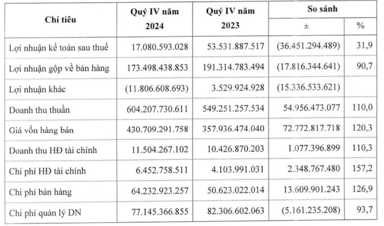 Chi phí tài chính cũng tăng đột biến 57%, lên mức 6,5 tỷ đồng, góp phần làm giảm lợi nhuận ròng. Kết quả, lợi nhuận sau thuế quý IV/2024 chỉ đạt 17 tỷ đồng, giảm tới 68% so với cùng kỳ.