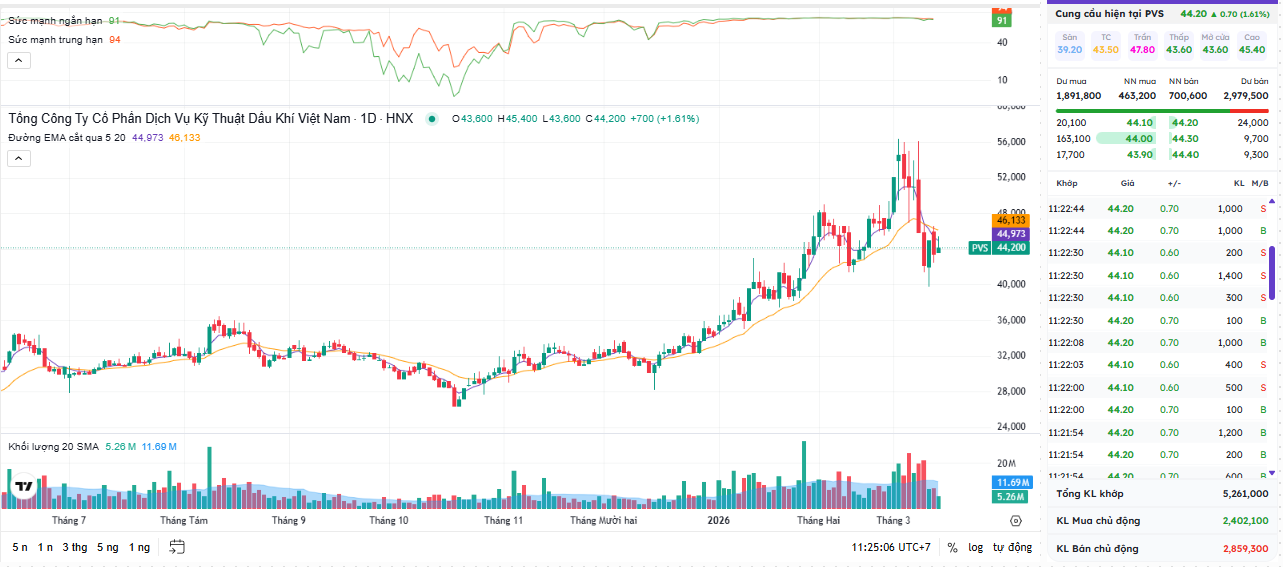 Tính từ đầu năm 2026, PVS từng có nhịp tăng giá “thần tốc” lên tới gần 50%, chạm đỉnh lịch sử tại mốc 54.600 đồng/cp (phiên 3/3). Tuy nhiên, những phiên hoảng loạn gần đây (đặc biệt là phiên giảm sâu 8% vừa qua) đã đưa định giá PVS lùi về vùng chiết khấu cực kỳ hấp dẫn.
