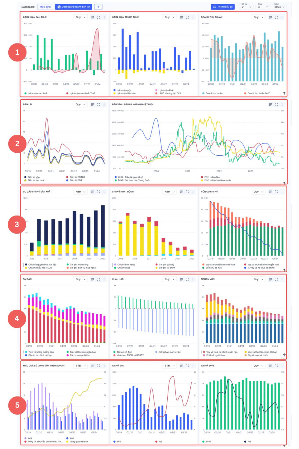 Ngành tiện ích điện là một trong 10 ngành có giá trị vốn hóa lớn nhất tại Việt Nam, nhưng để hiểu sâu hơn về ngành này, cần một cách tiếp cận hệ thống và chi tiết. Chuỗi phân tích sẽ bắt đầu từ Lợi nhuận sau thuế, sau đó bóc tách sâu vào Hoạt động kinh doanh, Chi phí, Biên lợi nhuận của doanh nghiệp. Tiếp đến, Tài sản và Nguồn vốn được đào sâu giúp làm rõ năng lực của doanh nghiệp. Cuối cùng là phân tích hiệu quả hoạt động và định giá của doanh nghiệp. Tổng quan các biểu đồ theo nhóm phân tích bao gồm: