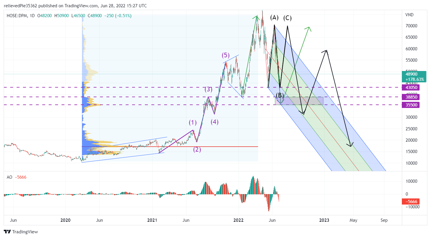 Vùng mua 38-43 (+/-), vùng bán 6x (có thể bán dưới 60 cho an toàn). Xác suất đi theo đường ABC đen tích lũy trước khi vào sóng chỉnh tiếp theo. C là sóng tổng quát.