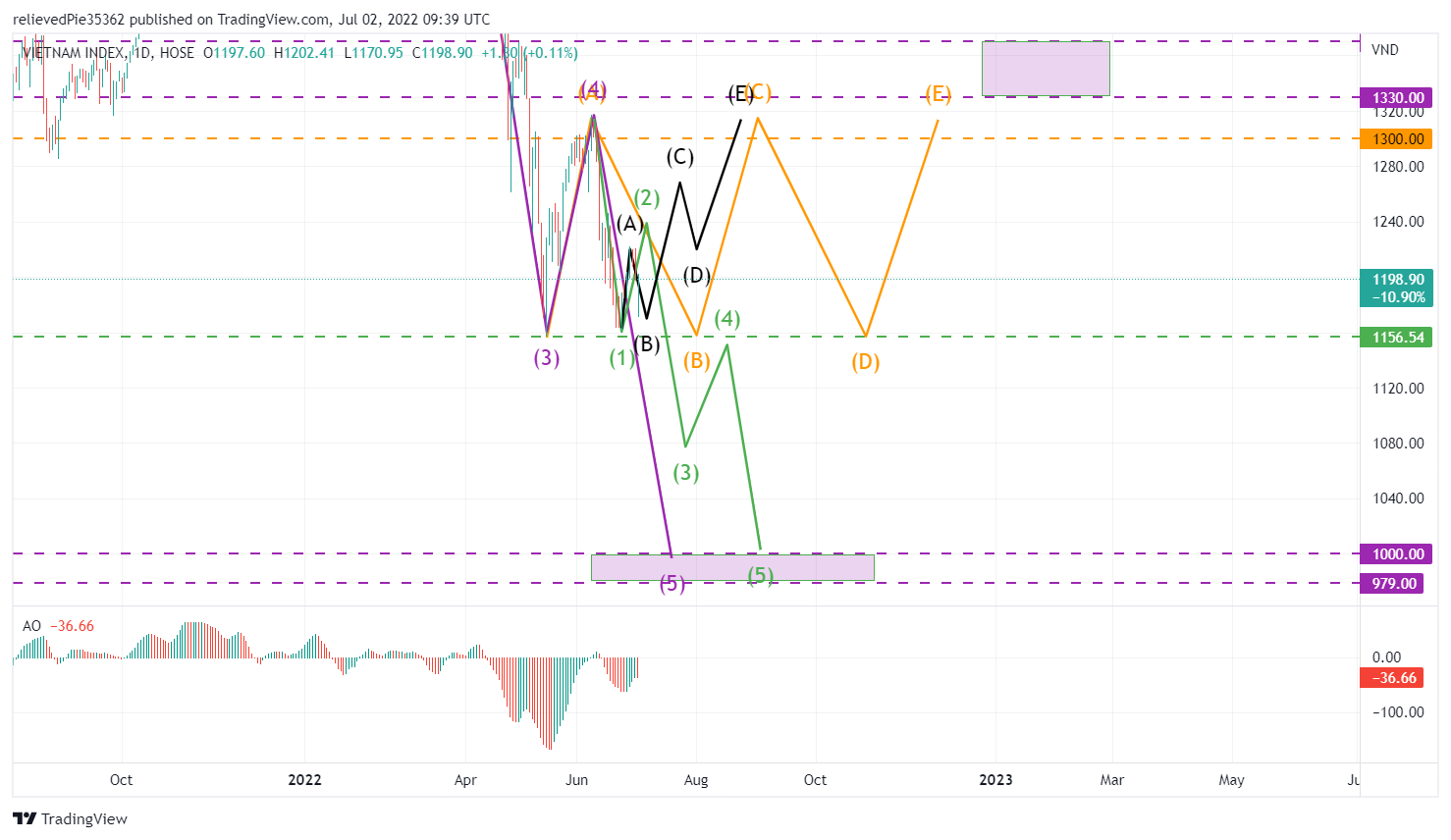 Nếu xác định sideway theo cam thì giờ đi tìm C cam, sóng nhỏ là abcde đen. Nếu breakdown thì đang đi nhịp hồi 2 xanh lá, sau đó tìm 345 xanh lá. 2 xanh lá có mục tiêu khu 1240, 3 xanh lá có mục tiêu 1050-1090, 4 xanh lá có mục tiêu 1160, 5 xanh lá có mục tiêu thấp hơn hoặc bằng 3 xanh lá.
