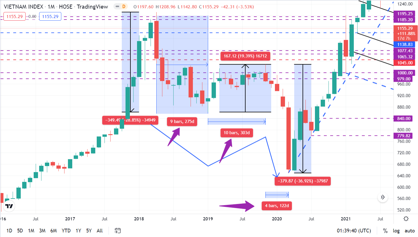 Độ trễ khoảng 6-12 tháng, giả sử mô hình như 2018 (xác suất 2007-2009 có nhưng nhỏ), thời gian tạo đáy 23 tháng (nhịp đầu 9 tháng, nhịp hồi 10 tháng, nhịp chỉnh cuối 4 tháng), mới chỉnh vài ba tháng mà mong lên 3k thì đúng là tiền như lá mít, tài phiệt và cá mập ngốc đến dễ sợ.
