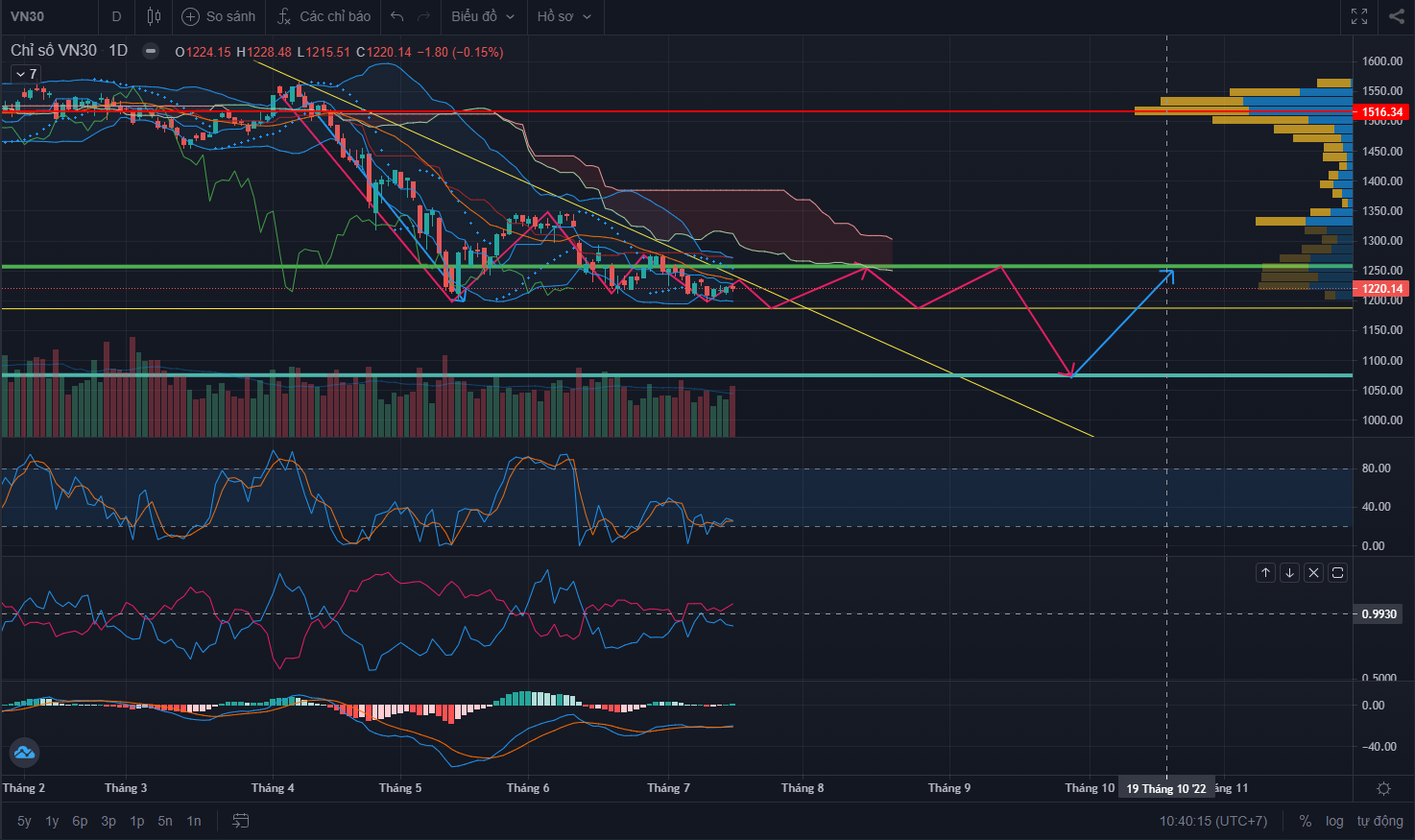 Đa số các cổ phiếu thủng MA200 hồi mạnh đều đang tích lũy dưới và quanh MA50 chờ một xu hướng để chỉnh, Index mạnh thì lên test MA50 khu 1221 (đỉnh của nhịp flat) Nhịp trước mới đến MA40 (1317-hidden bull), cần thời gian tích lũy khá lâu để kéo các đường MA100-MA200 xuống, một giấc mơ không thành hiện thực là sóng lên trên MA200 để lên sóng tăng mấy nghìn nâng hạng, hiện trạng bây giờ khác hoàn toàn giai đoạn 2018-2019, cũng khác luôn giai đoạn tháng 7,8/2021 (tiền đã rút ra khỏi chứng khoán). Hiện Index vẫn đang ở nhịp flat mục tiêu 1200, nến ngắn và đều dần hãm dần độ rơi nên đột phá lên phía trên là khó, đáy nhịp đầu trung hạn nông thì còn khả thi. Lịch từ tuần này đến cuối tháng (9-10 phiên) không còn nhiều và gần như không có yếu tố tích cực để đánh lên, nếu cố thì rướn lên 1200-1221 (chưa break được mô hình bô úp).
