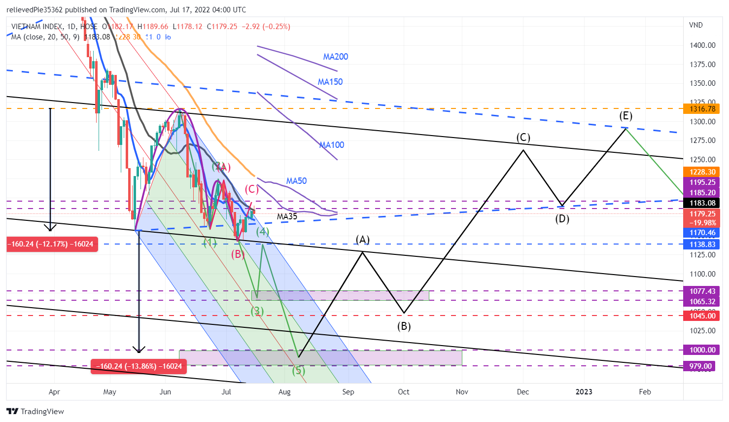Sóng hồi mạnh nếu có sẽ tiến tới test MA200 (đỉnh E) không thì khoảng đỉnh C (MA150).