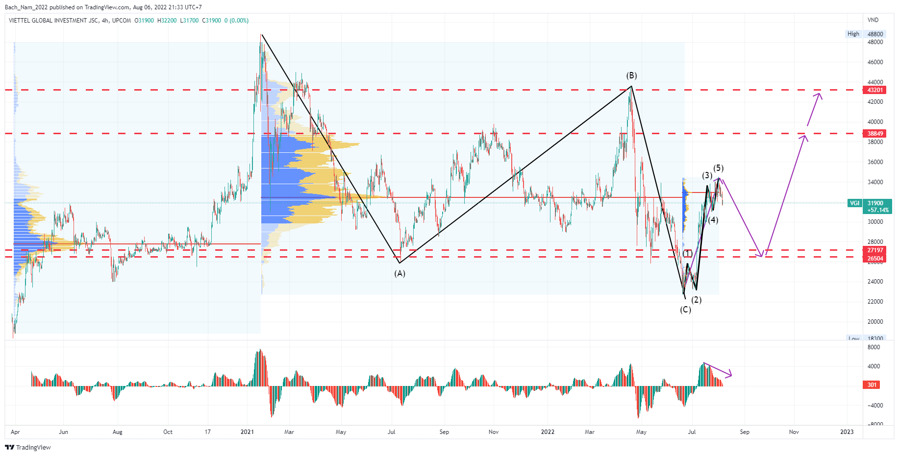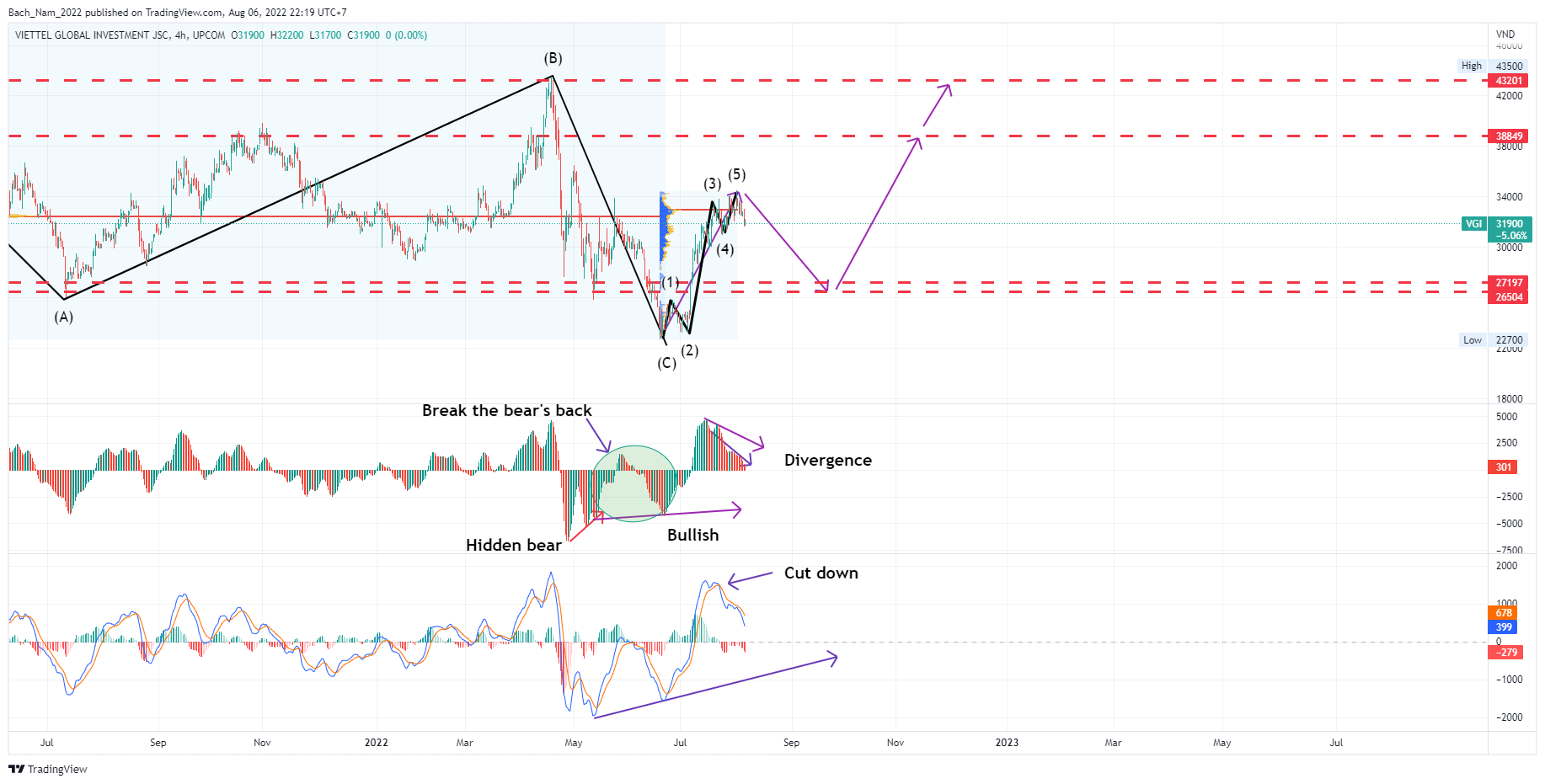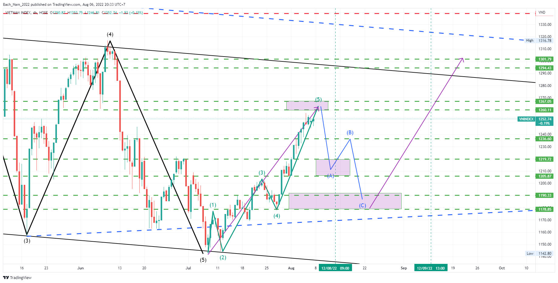 Sóng chỉnh nhịp đầu trung hạn đã xác nhận, đang đi nhịp 2 sóng chính là ABC gồm hai đường tím (không vẽ đánh dấu sóng vì rối) + nhịp ABC xanh blue. Trường hợp an toàn thì như hình, còn mạo hiểm hơn thì nhà cái có thể đánh lên khu 1300 mới chỉnh (chỉnh sốc hơn, khi đó target sóng sau là khu 1317-1340, an toàn chốt lãi dần khu 1300).