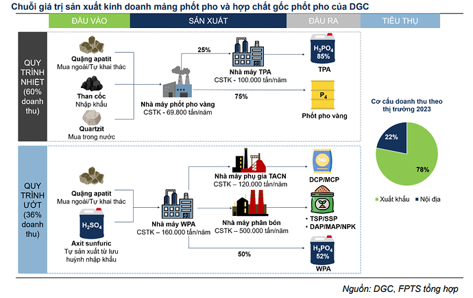- Đầu tiên, DGC là một trong số ít các doanh nghiệp trên thế giới hiện nay có thể sản xuất được tất cả các sản phẩm từ photpho như Phốt pho vàng (P4); axit photphoric, cũng như phân bón tổng hợp, dạng MAP (Monoammonium Phosphate) và DAP (Diammonium Phosphate), đáp ứng các tiêu chuẩn xuất khẩu. DGC là đơn vị dẫn đầu trong mảng photpho và gần như đại diện cho năng lực sản xuất P4 của Việt Nam với tổng công suất lên đến 80,000 tấn sản phẩm mỗi năm. => Vị thế top 1 ngành