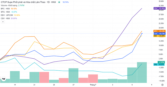 Trong phiên sáng 8/7, loạt cổ phiếu phân bón thuộc Tập đoàn Hóa chất Việt Nam (Vinachem) đồng loạt ‘tím lịm’ với BFC (+6,9%), SFG (+6,9%), LAS (+9,8%), trong đó có cổ phiếu của Phân bón Bình Điền (BFC) và Phân bón Lâm Thao (LAS) cùng vượt đỉnh lịch sử. Các mã phân bón khác cũng đều tăng như DDV (+5,42%), CSV (+4,9%).